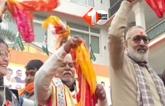 BEGUSARAI: 2025 में हुए बिहार विधानसभा चुनाव के नतीजे एक महीने पहले ही जारी कर दिया गया है लेकिन इसका जश्न एक महीने बाद भी मनाया जा रहा है। इस बार बिहार के बेगूसराय जिले में अपार जीत के इस जश्न को मनाया गया। इस मौके पर बीजेपी के वरिष्ठ नेताओं ने जोड़ी मोदी नीतीश के हिट हो गईल गाने पर हाथ में गमछा लहराया और अपनी खुशी का इजहार किया। इस मौके पर केन्द्रीय मंत्री गिरिराज सिंह, बिहार विधानसभा अध्यक्ष डॉ. प्रेम कुमार ने हाथ में गमछा लहराया और जीत का जश्न मनाया।