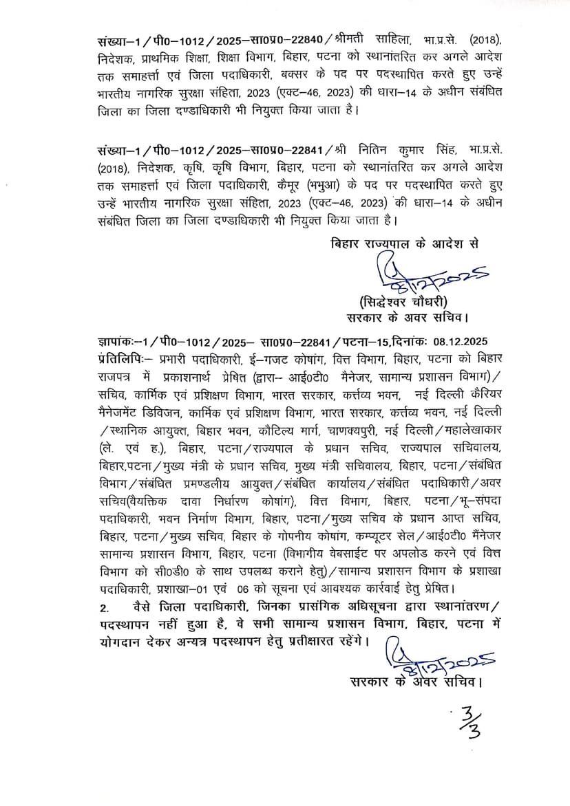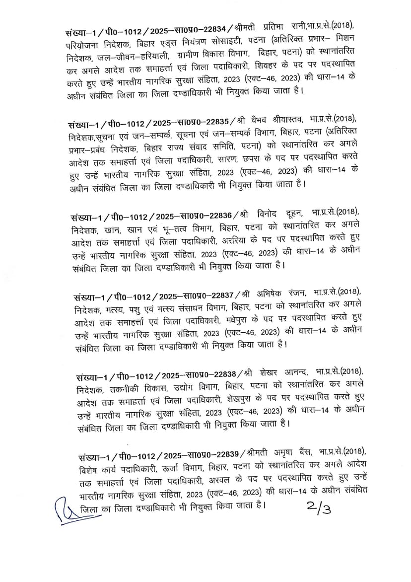 प्रतिभा रानी को शिवहर का नया जिलाधिकारी बनाया गया है। सूचना जनसंपर्क विभाग के निदेशक वैभव श्रीवास्तव को सारण का जिलाधिकारी बनाया गया है। खान निदेशक विनोद दुहन को अररिया जिला अधिकारी बनाया गया है। निदेशक मत्स्य विभाग अभिषेक रंजन को मधेपुरा का जिलाधिकारी, उद्योग विभाग में निदेशक शेखर आनंद को जिलाधिकारी शेखपुरा, ऊर्जा विभाग में विशेष कार्य पदाधिकारी अमृषा बैंस को अरवल का जिलाधिकारी, प्राथमिक शिक्षा के निदेशक साहिला को बक्सर का जिलाधिकारी और कृषि विभाग में निदेशक नितिन कुमार सिंह को कैमूर का जिलाधिकारी बनाया गया है।