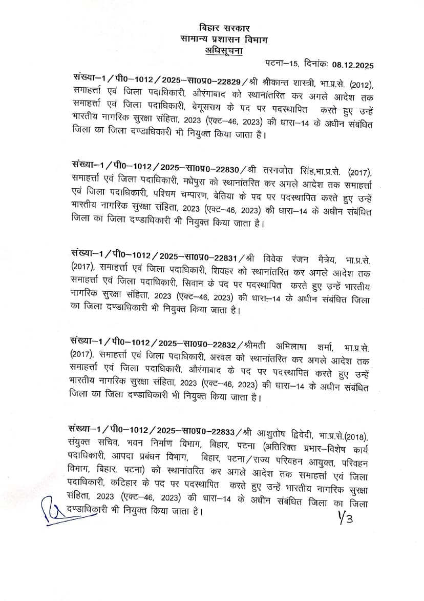 औरंगाबाद के जिलाधिकारी श्रीकांत शास्त्री को बेगूसराय का नया जिलाधिकारी बनाया गया है। मधेपुरा के जिलाधिकारी तरनजोत सिंह को पश्चिम चंपारण का जिलाधिकारी, शिवहर के जिलाधिकारी विवेक रंजन को सिवान जिलाधिकारी के पद पर पदस्थापित किया गया है।अरवल की जिलाधिकारी अभिलाष शर्मा को औरंगाबाद का जिलाधिकारी बनाया गया है। भवन निर्माण विभाग के संयुक्त सचिव आशुतोष द्विवेदी को कटिहार का जिलाधिकारी बनाया गया है।