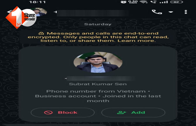 MUZAFFARPUR: मुजफ्फरपुर जिलाधिकारी सुब्रत कुमार सेन के नाम से मोबाइल नंबर 84589267391 का दुरुपयोग करते हुए एक फर्जी व्हाट्सएप प्रोफाइल बनाए जाने की सूचना जिला प्रशासन को प्राप्त हुई है। इस संबंध में जिलाधिकारी ने स्पष्ट किया है कि उक्त मोबाइल नंबर अथवा उससे संचालित कोई भी व्हाट्सएप प्रोफाइल उनका अधिकृत संपर्क माध्यम नहीं है।