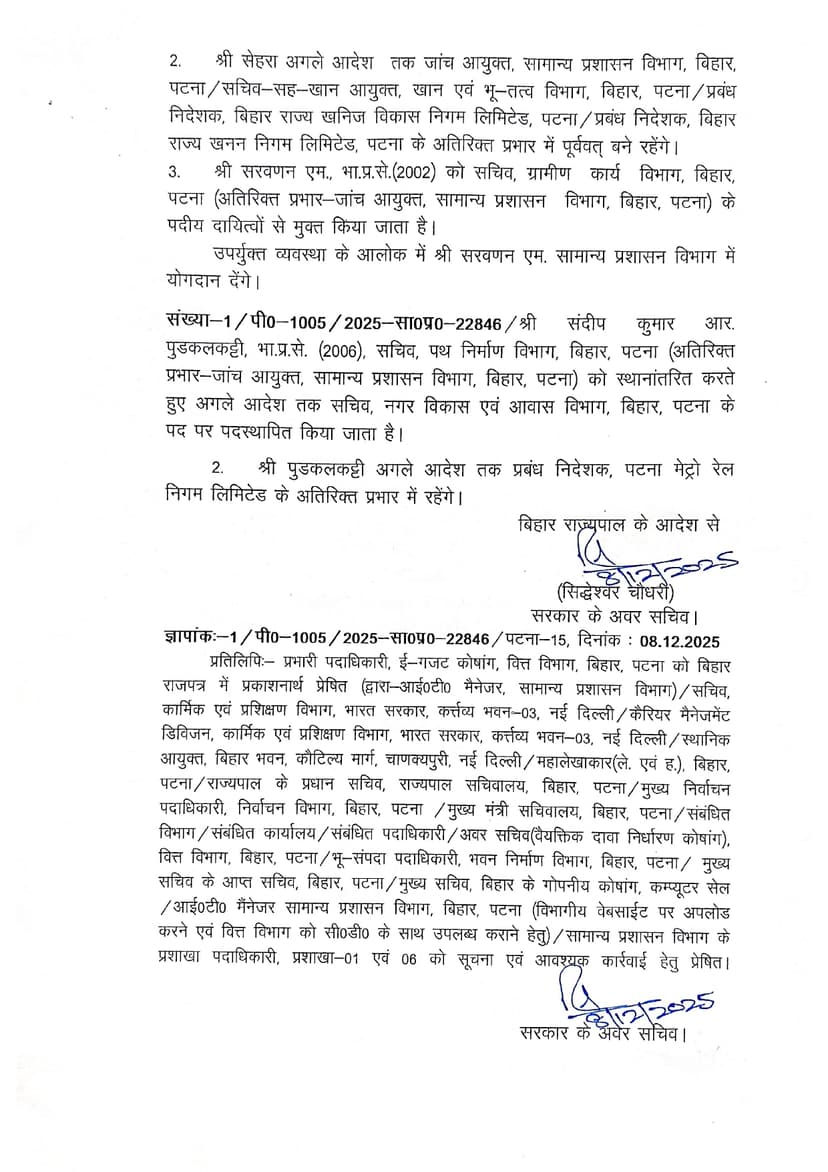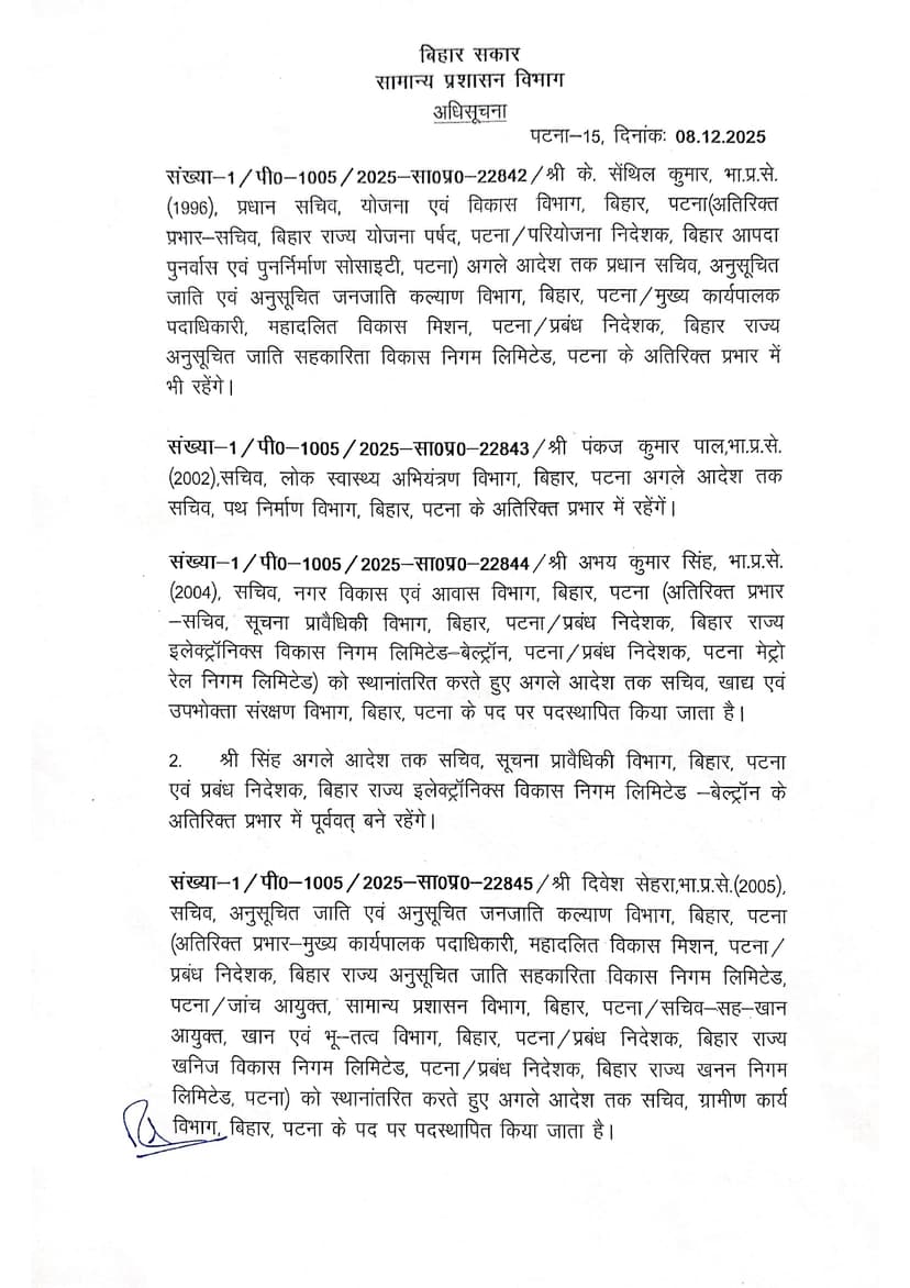योजना एवं विकास विभाग के प्रधान सचिव के सेंथिल कुमार को अब बिहार राज्य अनुसूचित जाति सहकारिता विकास निगम के प्रबंध निदेशक का अतिरिक्त प्रभार भी दिया गया है। वहीं लोक स्वास्थ्य अभियंत्रण विभाग के सचिव पंकज कुमार पाल को पथ निर्माण विभाग के सचिव का अतिरिक्त प्रभार दिया गया है।