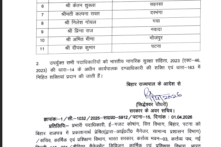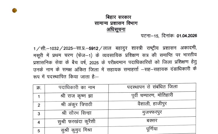 PATNA: बिहार में 2025 बैच के 11 आईएएस अधिकारियों को विभिन्न जिलों में सहायक समाहर्ता एवं सहायक दंडाधिकारी के रूप में तैनात किया गया है। ये अधिकारी लाल बहादुर शास्त्री राष्ट्रीय प्रशासन अकादमी, मसूरी में प्रथम चरण के व्यवसायिक प्रशिक्षण सत्र पूरी करने के बाद जिलों में भेजे गए हैं।