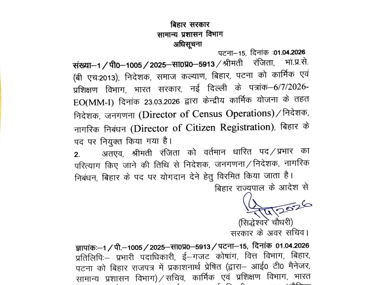 वही समाज कल्याण विभाग की निदेशक और 2013 बैच की आईएएस रंजिता को जनगणना एवं नागरिक निबंधन का निदेशक बनाया गया है। वर्तमान पद का परित्याग किये जाने की तिथि से नए पद पर योगदान देने के लिए विरमित किया गया है। सामान्य प्रशासन विभाग ने इसकी अधिसूचना जारी की है।