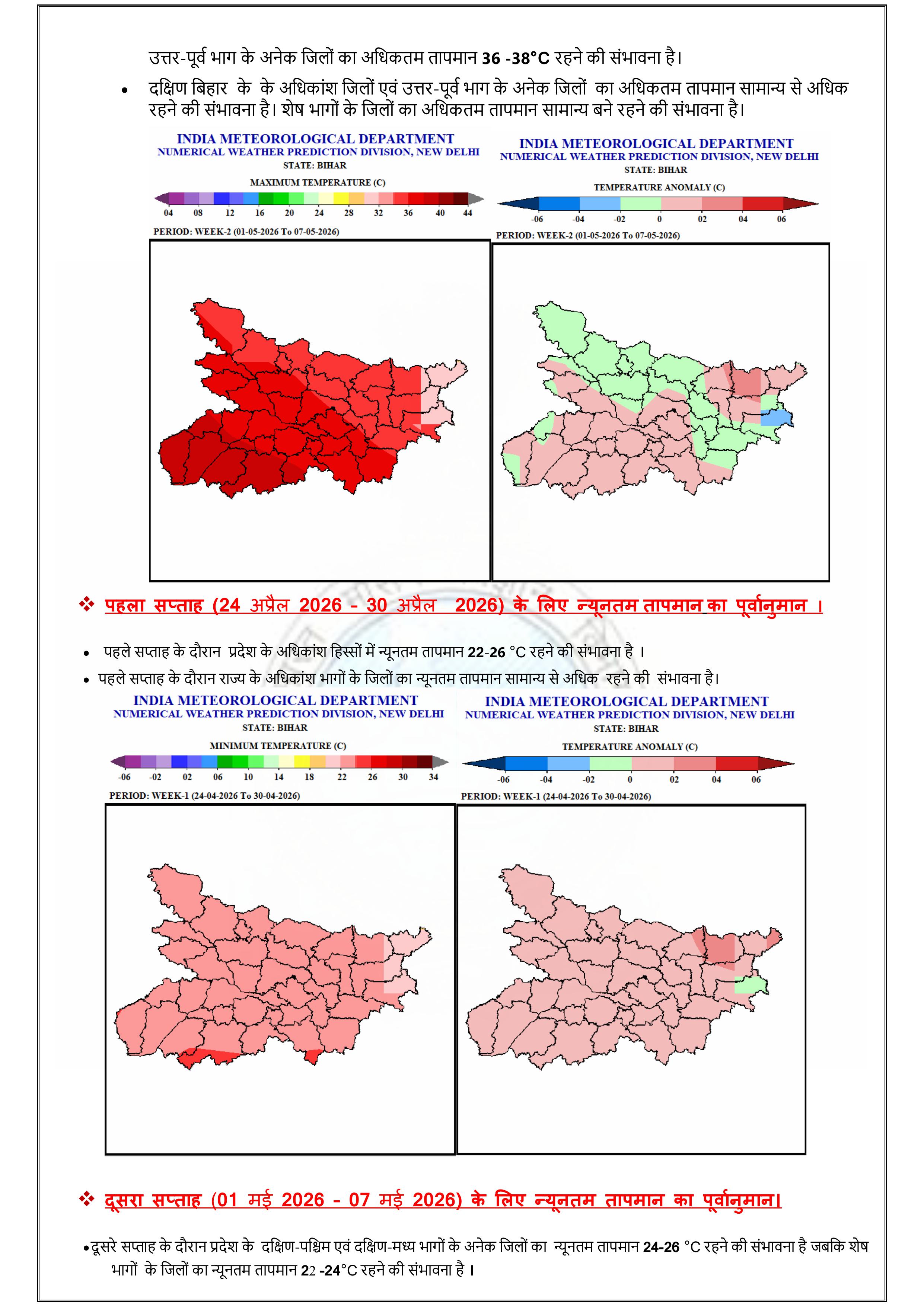 जारी पूर्वानुमान के अनुसार, उत्तर बिहार के जिलों में सामान्य से अधिक वर्षा होने की संभावना है, जबकि दक्षिण बिहार में सामान्य से कम बारिश हो सकती है।
