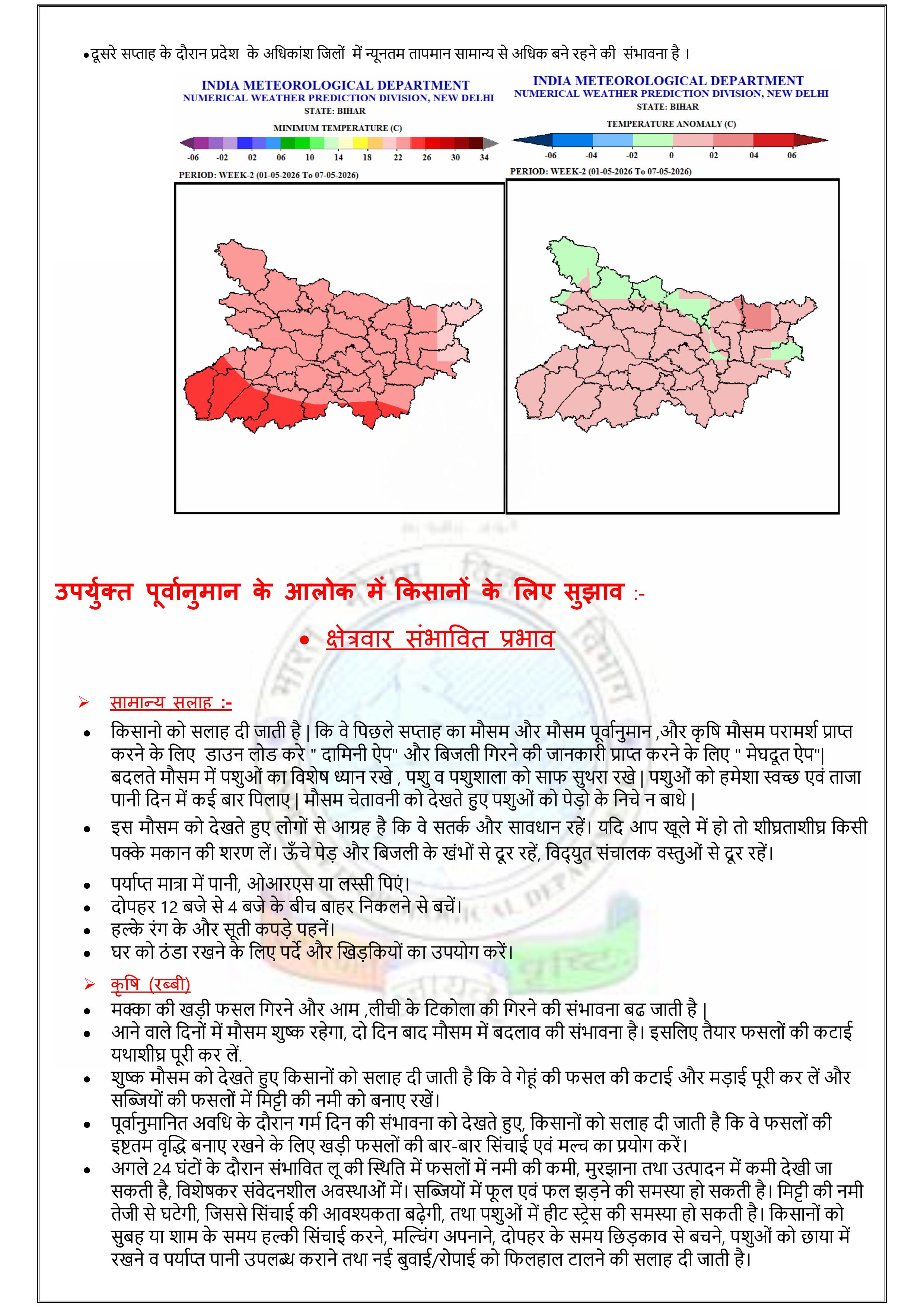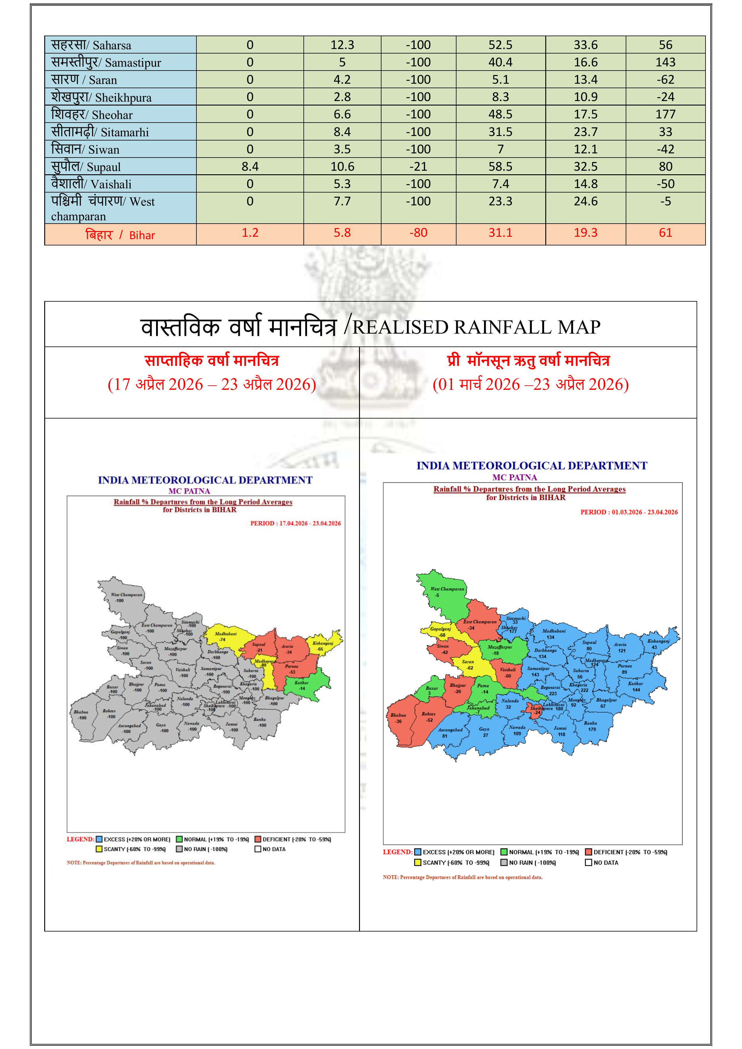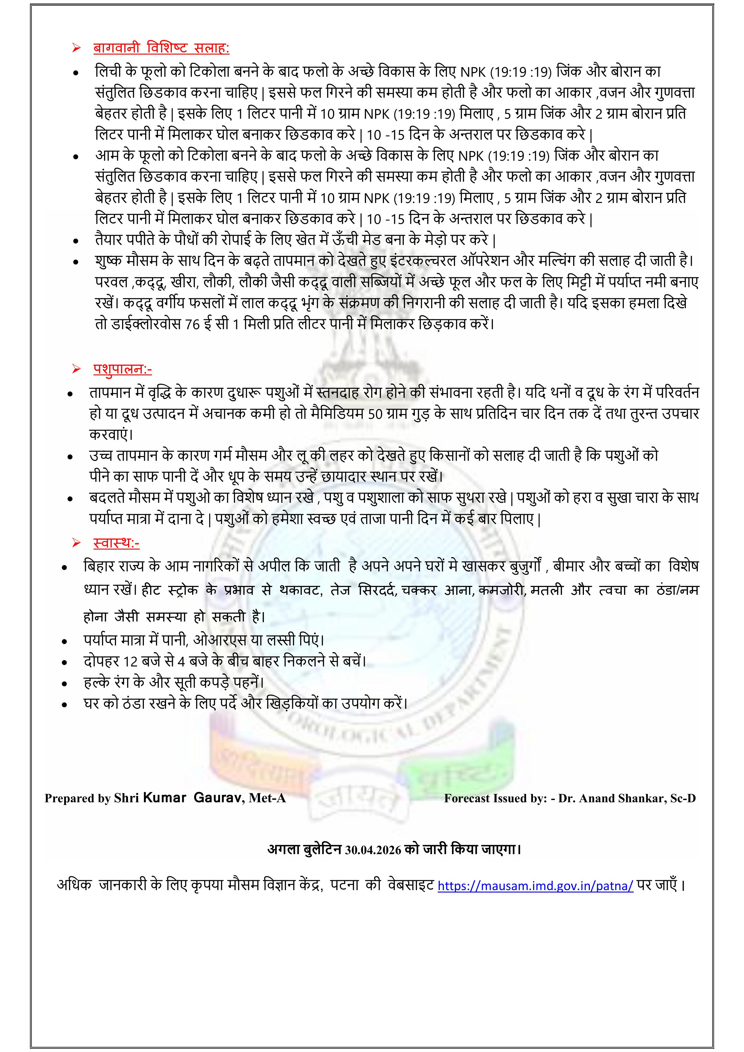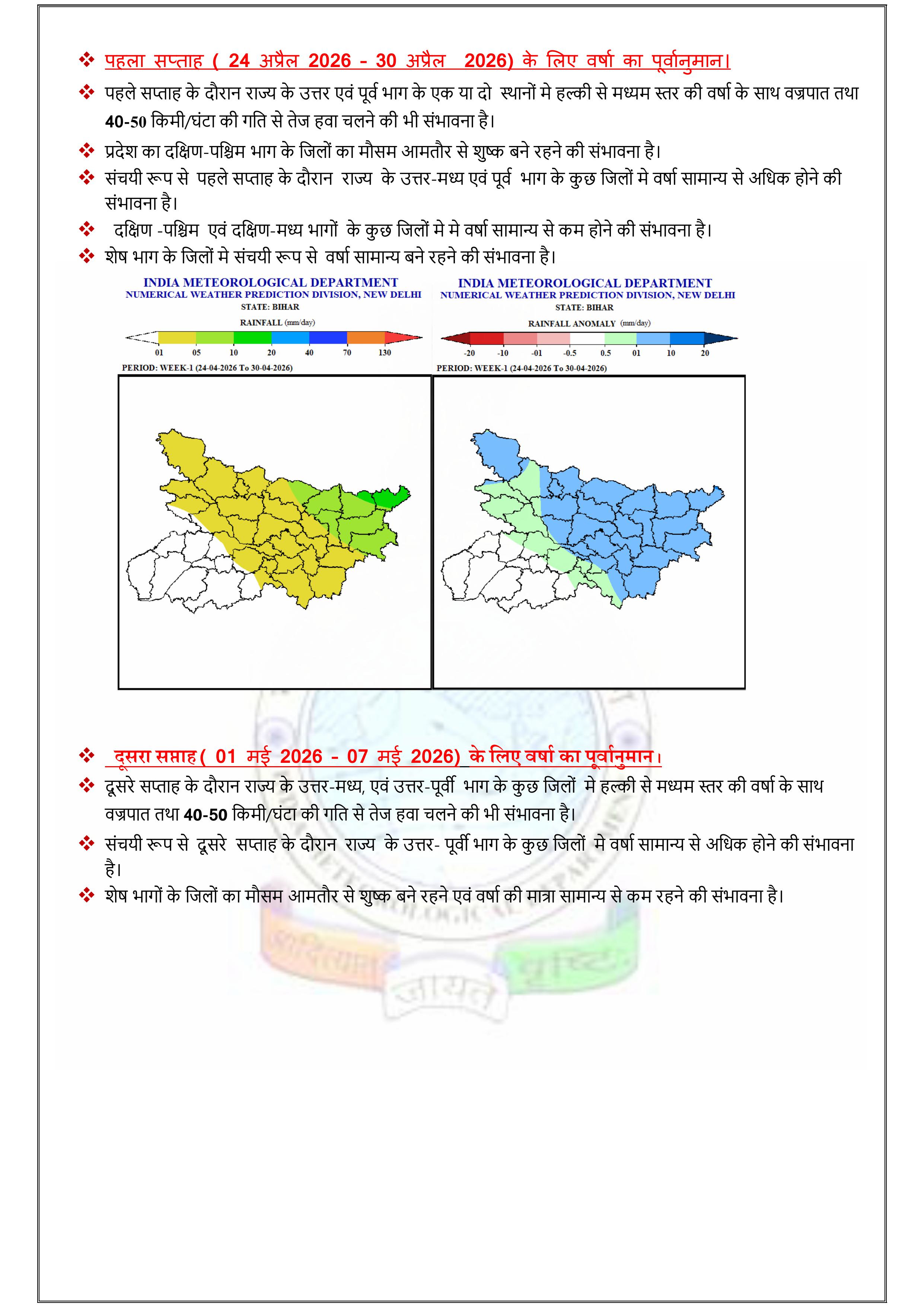 PATNA: मौसम विभाग, पटना ने 26 से 30 अप्रैल के बीच पूरे बिहार के लिए अलर्ट जारी किया है। इस अवधि में आंधी-तूफान, बारिश और वज्रपात की संभावना जताई गई है, जिससे लोगों को सतर्क रहने की सलाह दी गई है।