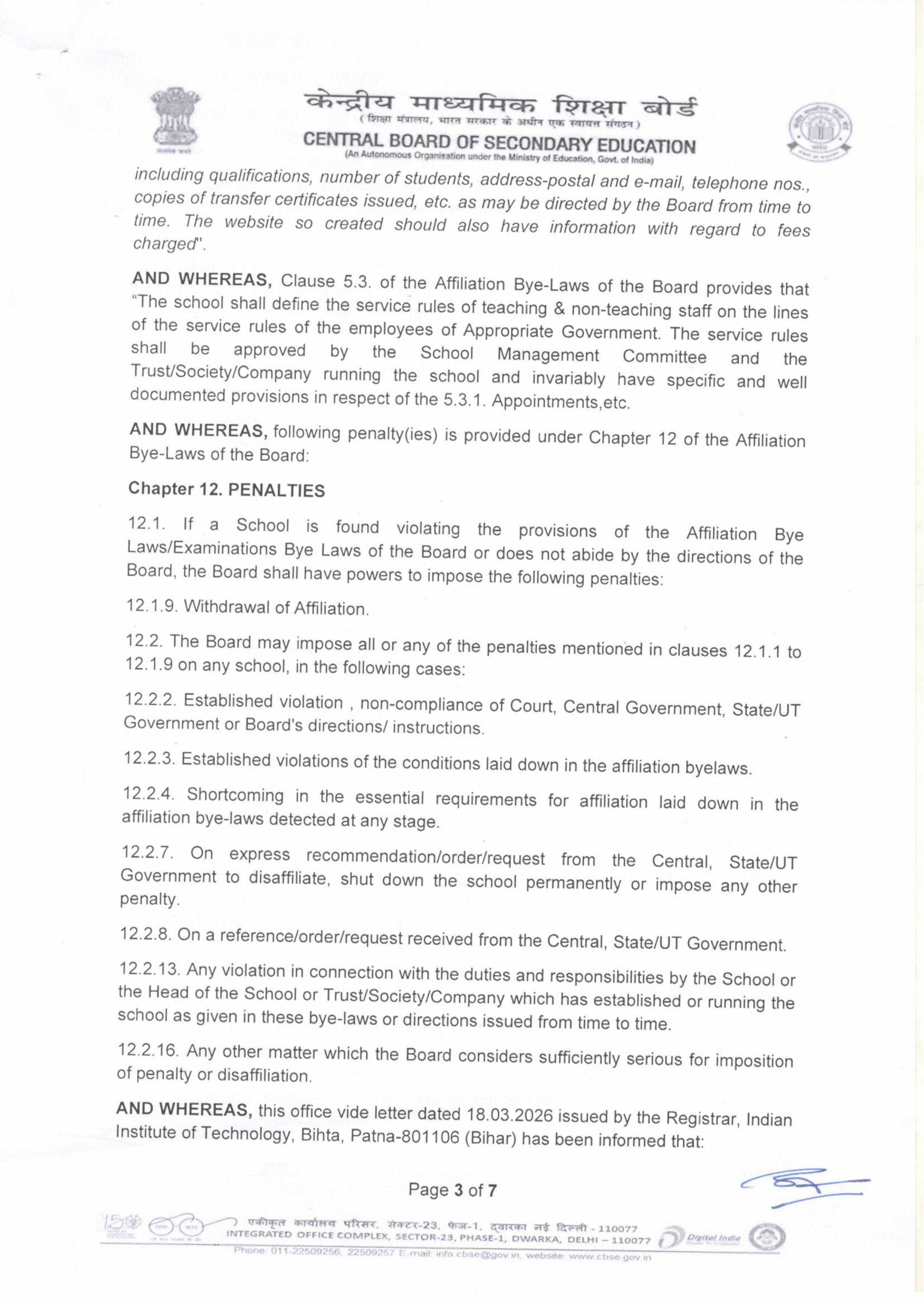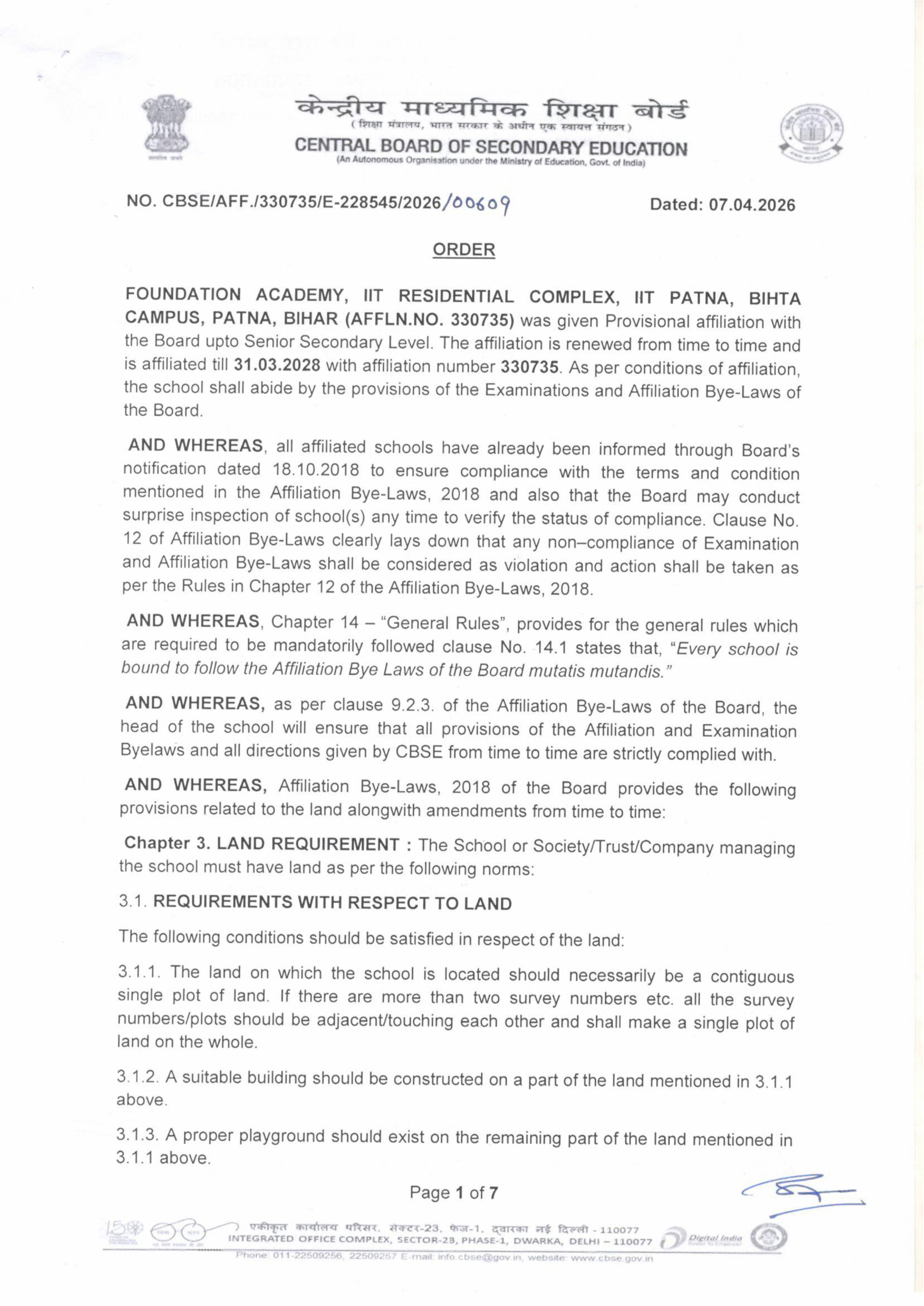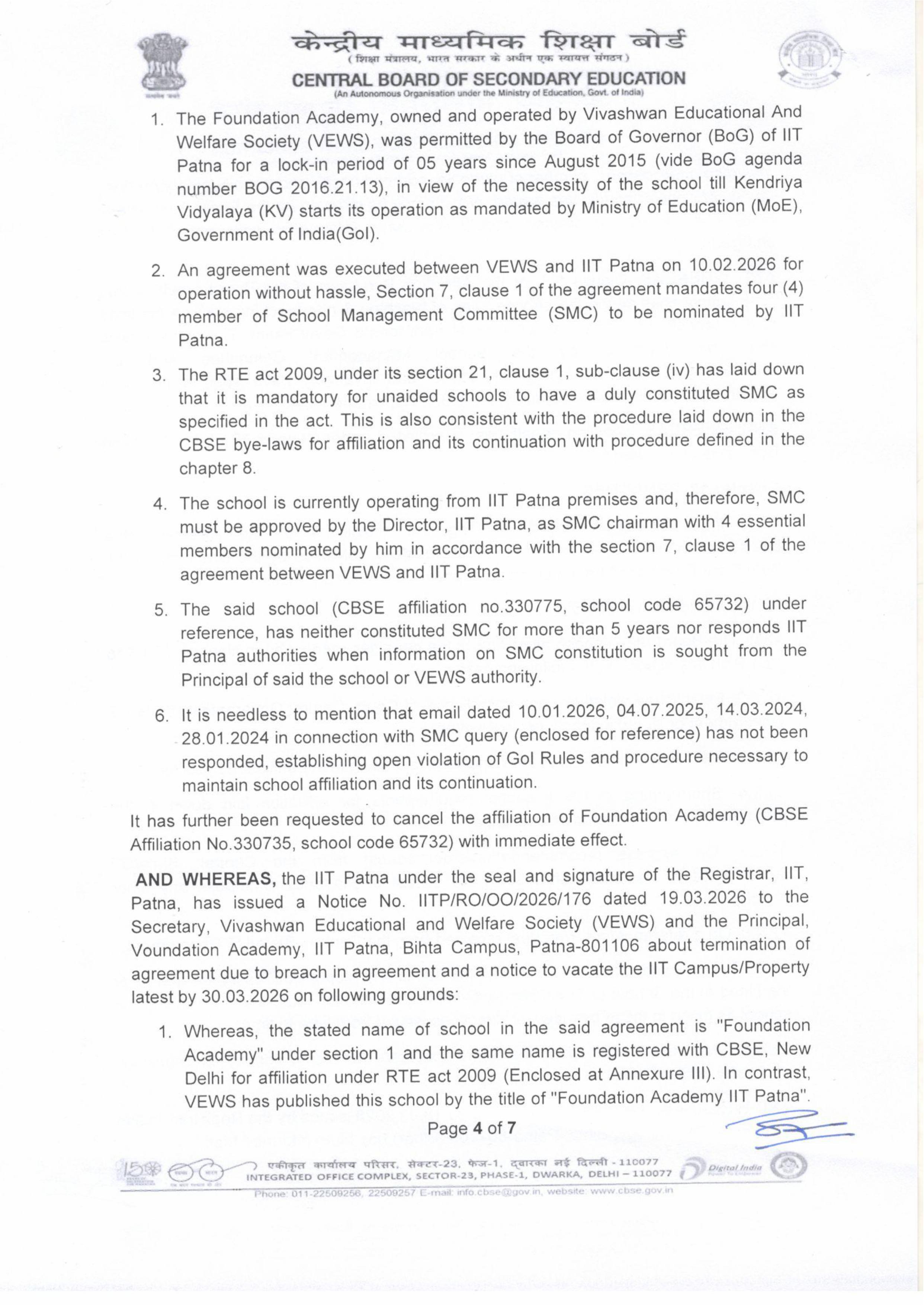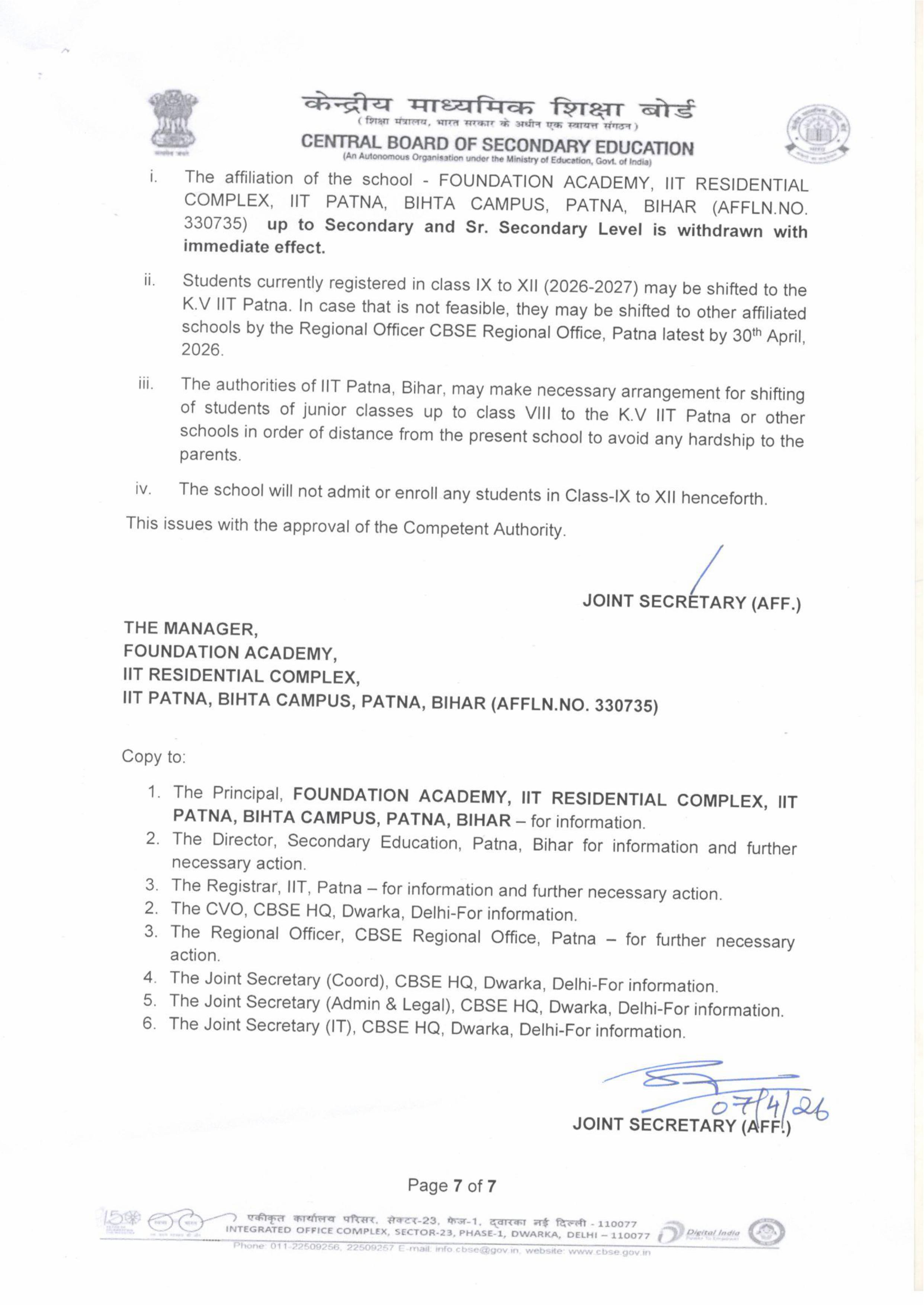 PATNA: पटना से बड़ी खबर सामने आ रही है, जहां आईआईटी पटना (बिहटा) परिसर में स्थित फाउंडेशन एकेडमी और आईआईटी प्रशासन के बीच चल रहे विवाद में नया मोड़ आ गया है। केंद्रीय माध्यमिक शिक्षा बोर्ड (CBSE) ने तत्काल प्रभाव से स्कूल की मान्यता रद्द कर दी है और इस संबंध में आदेश भी जारी कर दिया गया है।