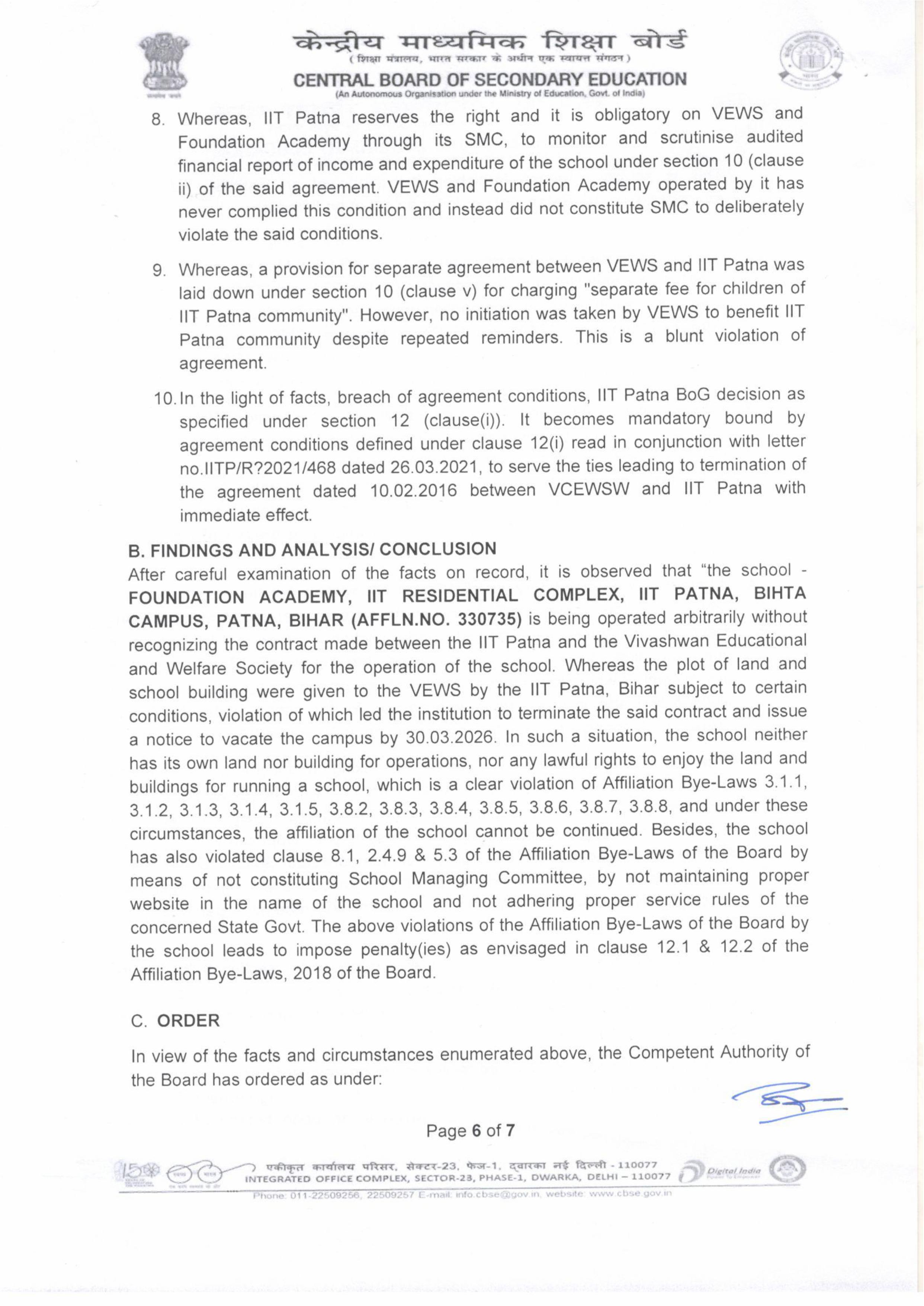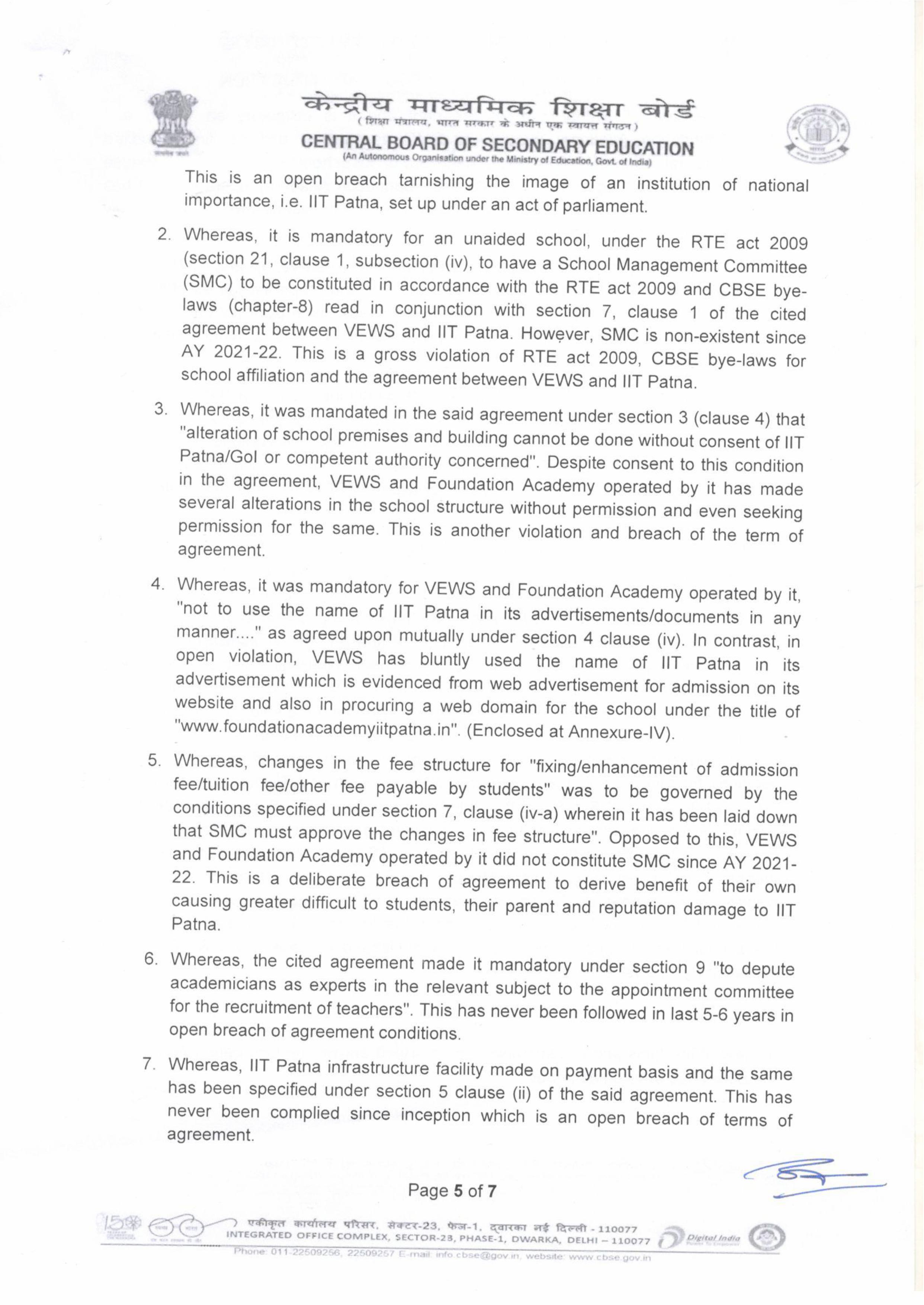 कुलसचिव ने कहा था कि फाउंडेशन एकेडमी की प्रिंसिपल आभा कुमारी द्वारा किया दावा पूरी तरह से गलत है। उन्होंने बताया कि शिक्षा मंत्रालय ने 11 फरवरी 2020 को जारी पत्र में स्पष्ट किया है कि यह समझौता नियमों के अनुरूप नहीं है। इसे शुरू से ही अमान्य माना जाएगा। मंत्रालय ने आईआईटी पटना के बोर्ड ऑफ गवर्नर्स के अध्यक्ष को संबोधित पत्र में कहा है कि 10 फरवरी 2016 को विवस्वान एजुकेशनल एंड वेलफेयर सोसाइटी के साथ स्कूल संचालन के लिए किया गया करार उस समय की वैधानिक व्यवस्था के खिलाफ था।