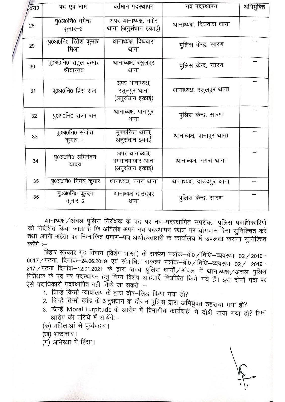 SARAN: सारण में बड़े पैमाने पर पुलिस पदाधिकारियों का तबादला किया गया है। 36 पुलिस पदाधिकारियों को एक थाने से दूसरे थाने या पुलिस केंद्र भेजा गया है।