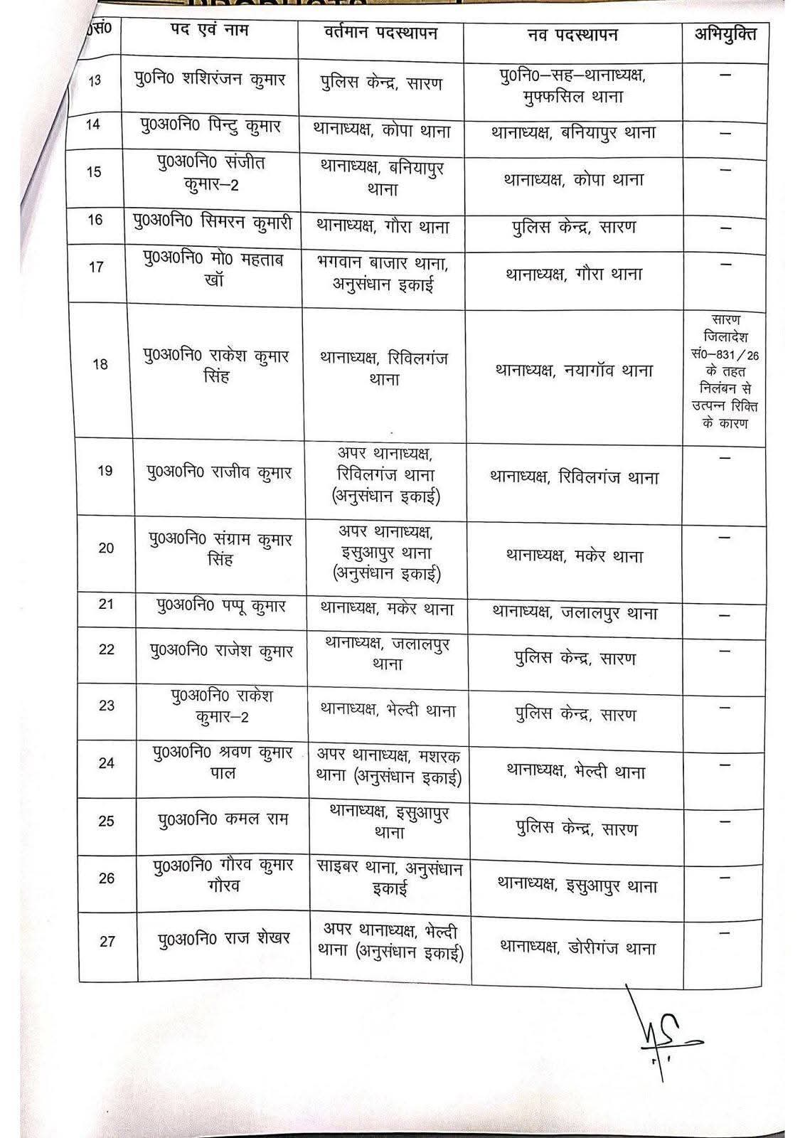 इनमें एकमा थाना के थानाध्यक्ष ध्रुव प्रसाद सिंह, मशरक थाना के थानाध्यक्ष रंजीत कुमार, गौरा थाना की थानाध्यक्ष सिमरन कुमारी, जलालपुर थाना के थानेदार राजेश कुमार, भेल्दी थाना के थानाध्यक्ष राकेश कुमार, इसुआपुर थाना के थानेदार कमल राम, दिघवारा थाना के थानाध्यक्ष रितेश कुमार मिश्रा, रसूलपुर थाना के थानेदार राहुल कुमार श्रीवास्तव, पानापुर थाना के थानेदार राजा राम और दाउदपुर थाना के थानेदार कुंदन कुमार शामिल हैं। पुलिस प्रशासन द्वारा किए गए इस बड़े फेरबदल को कानून-व्यवस्था को और मजबूत करने के उद्देश्य से जोड़ा जा रहा है। अन्य स्थानांतरित पदाधिकारियों की पूरी सूची भी जारी कर दी गई है।