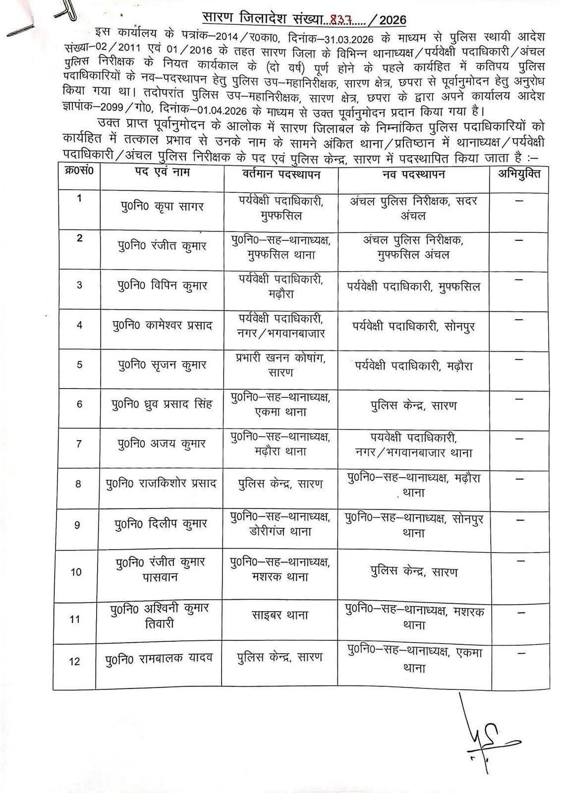 जिले में बड़े पैमाने पर पुलिस पदाधिकारियों का तबादला किया गया है। प्रशासनिक फेरबदल के तहत कुल 36 पुलिस पदाधिकारियों को एक थाना से दूसरे थाना या पुलिस केंद्र में स्थानांतरित किया गया है। इस कार्रवाई के तहत कई थानों के थानाध्यक्षों को उनके पद से हटाकर सारण पुलिस केंद्र भेज दिया गया है।