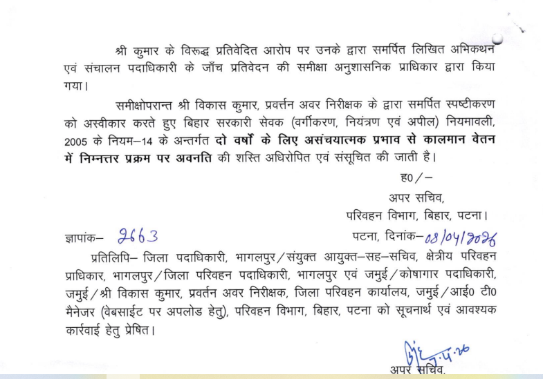 साथ ही संचालन पदाधिकारी ने निगरानी थाना कांड संख्या 19/ 2023 को अनुसंधान के अंतर्गत बताया. जांच प्रतिवेदन की समीक्षा, संचालन पदाधिकारी के मंतव्य से विभाग सहमत हुआ. इसके बाद आरोपी प्रवर्तन अवर निरीक्षक से लिखित अभिकथन की मांग की गई. विकास कुमार ने 24 अप्रैल 2025 को अपना लिखित जवाब समर्पित किया. इसके बाद परिवहन विभाग ने आरोपी प्रवर्तन अवर निरीक्षक विकास कुमार को दंड देने का निर्णय लिया. इन्हें दो वर्षों के लिए असंचयात्मक प्रभाव से कालमान वेतन में निम्नतर प्रक्रम पर अवनति का दंड अधिरोपित किया गया है. परिवहन विभाग के अपर सचिव ने 8 अप्रैल 2026 को यह आदेश जारी किया है.