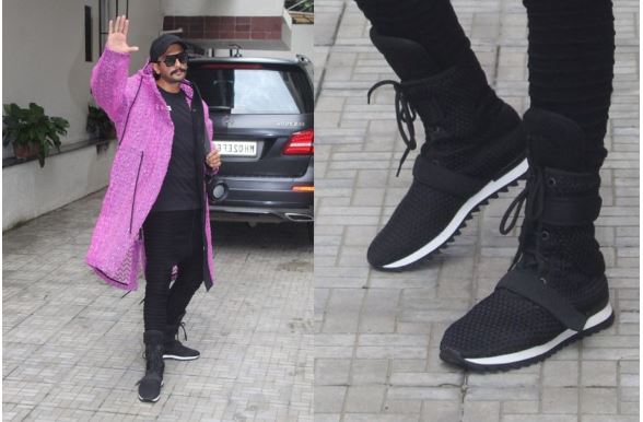 DESK : अपने जबरदस्त फैशन सेंस से हमेशा दर्शकों को अपनी ओर आकर्षित करने वाले रणवीर सिंह एक बार फिर से चर्चा में आ गये है. इस बार रणवीर पर्पल कलर के एक लंबे से ओवरकोट और कुछ अलग तरह के जूते पहनकर लोगों को हैरान कर दिया. दरअसल इस स्टाइल में रणवीर धर्मा प्रोडक्शन के दफ्तर पहुंचे. रणवीर ने जो जूता पहना है वो आम जूतों के डिजाइन से बिलकुल अलग है. रणवीर का ये स्टाइल सबका ध्यान उनकी ओर खीच लिया. जैकेट के कलर से लेकर जूतों का डिजाइन सबकुछ बिलकुल अलग दिखा.
