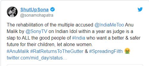 सोना ने अपने ट्वीट में लिखा है - सोनी टीवी द्वारा एक साल के अंदर अनु मलिक को दोबारा 'इंडियन आइडल' पर बुला लेना उन लोगों के मुंह पर थप्पड़ है जो भारत में अपने बच्चों के लिए एक बेहतर और सुरक्षित भविष्य चाहते हैं. इसके साथ सोना ने लिखा #AnuMalik #RatReturnsToTheGutter & #SpreadingFilth.अब इस ट्वीट पर अलग-अलग लोगों की प्रतिक्रियाएं सामने आ रही है. एक ट्वीटर यूजर ने लिखा है -यह देश के लिए शर्म की बात है जब अनु मलिक जैसे लोगों को आगे बढ़ाया जाता है.