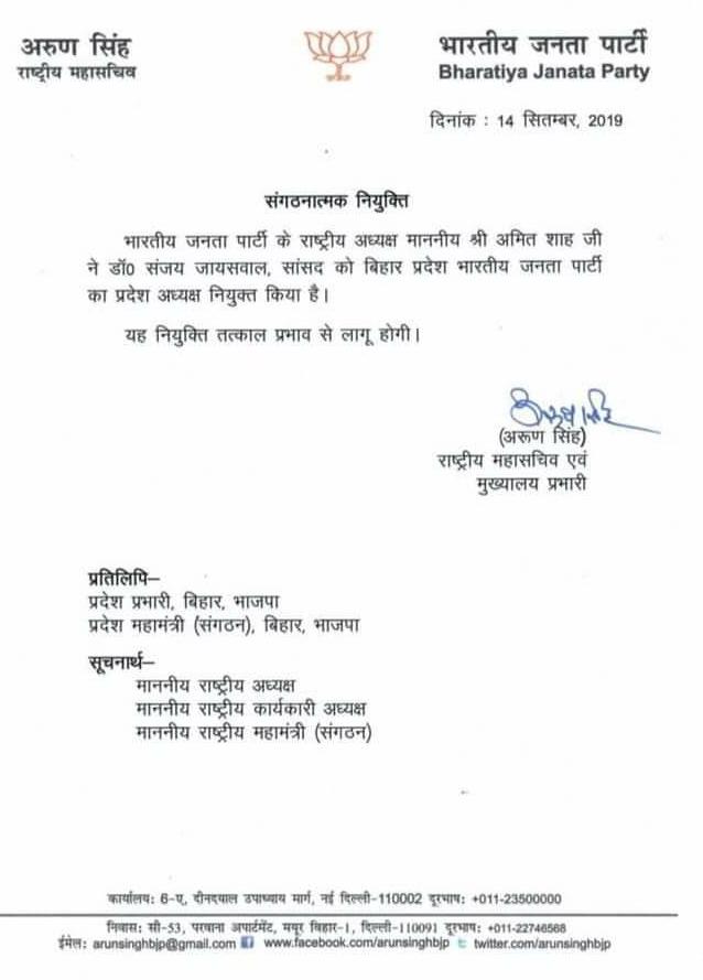 DELHI: पश्चिमी चंपारण से सांसद संजय जायसवाल को बीजेपी का नया प्रदेश अध्य़क्ष बनाया गया है. अमित शाह ने उन्हें नया अध्यक्ष बनाने की मंजूरी दे दी है. नित्यानंद राय के केंद्रीय मंत्री बनन