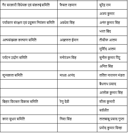 इस गठन में राज्यसभा चुनाव के दौरान वोटिंग से दूर रहे कांग्रेस विधायक मनोहर प्रसाद सिंह और राष्ट्रीय जनता दल (आरजेडी) के विधायक फैसल रहमान को भी एक-एक समिति का अध्यक्ष बनाया गया है।