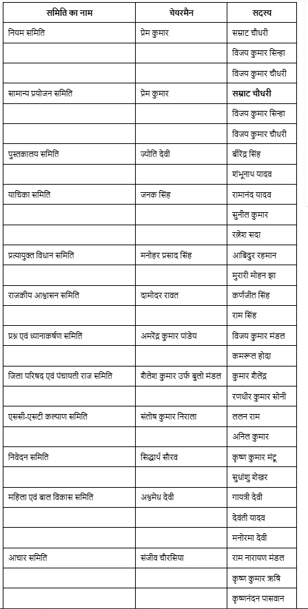 इन सभी समितियों का गठन वित्त वर्ष 2026-27 के लिए किया गया है, जिनका कार्यकाल 1 अप्रैल 2026 से 31 मार्च 2027 तक रहेगा। विधानसभा की नियम समिति के अध्यक्ष स्वयं स्पीकर प्रेम कुमार होंगे। इस समिति में उपमुख्यमंत्री सम्राट चौधरी, विजय कुमार सिन्हा और संसदीय कार्य मंत्री विजय कुमार चौधरी को सदस्य बनाया गया है।