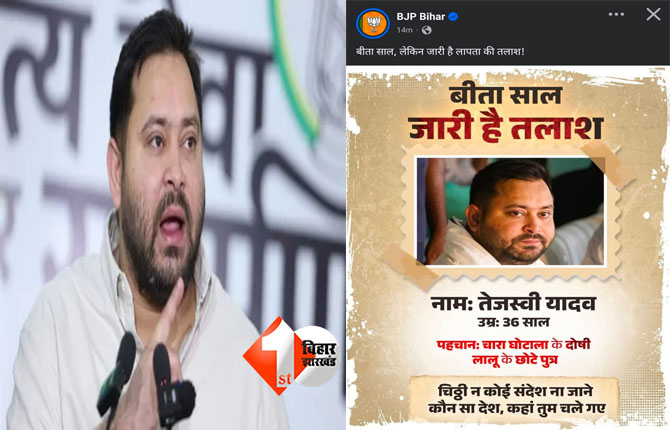 उधर, बीजेपी ने भी तेजस्वी पर हमला बोला है और उन्हें लापता घोषित कर दिया है। बिहार बीजेपी के आधिकारिक एक्स हैंडल पर तेजस्वी की तस्वीर के साथ लिखा, “बीता साल, लेकिन जारी है लापता की तलाश! नाम- तेजस्वी यादव, उम्र 36 साल, पहचान- चारा घोटाला के दोषी लालू के छोटे पुत्र, चिट्ठी ना कोई संदेश ना जाने कौन सा देश, कहां तुम चले गए”।